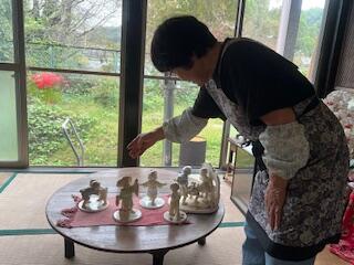 いつもの巌窟売店さんでいつものをいただきました。前回、白いシャツにカレー汁をはねさせてしまったということで、紙エプロンを用意してくださいました。ぶらっとよしみで開催されている愛ラブよしみコンクールで巌窟売店を描いた子供がいることをお伝えしました。女将さんが、西が丘小関係者のお客様が増えたので、お礼にこれをどうぞと、陶器製の人形をくださいました。西が丘小の宝として大切にさせていただきます。