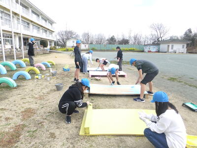 卒業まであと少しとなった6年生が在校生のために縄跳び板に絵を塗ってくれました。