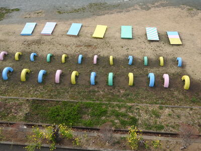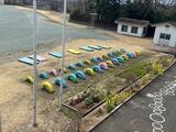 ペンキを塗る前に、6年生の子供たちから、「校長先生。どのような感じで、ペンキを塗ったらよいでしょうか?」と質問されたので、 「4台は、それぞれ単色の4色で。残りの2台ともともとのジャンプ台は、あなた方と先生のセンスにお任せします。」と伝えました。