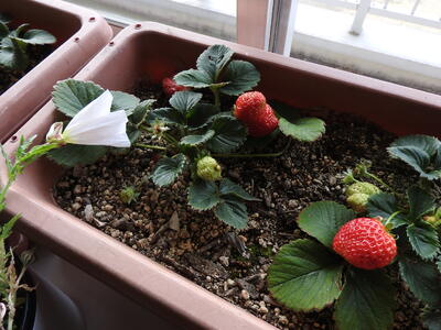 ひだまり学級の教室で育っている いちご おいしそうに輝いています。 その横には、月見草のお花が。